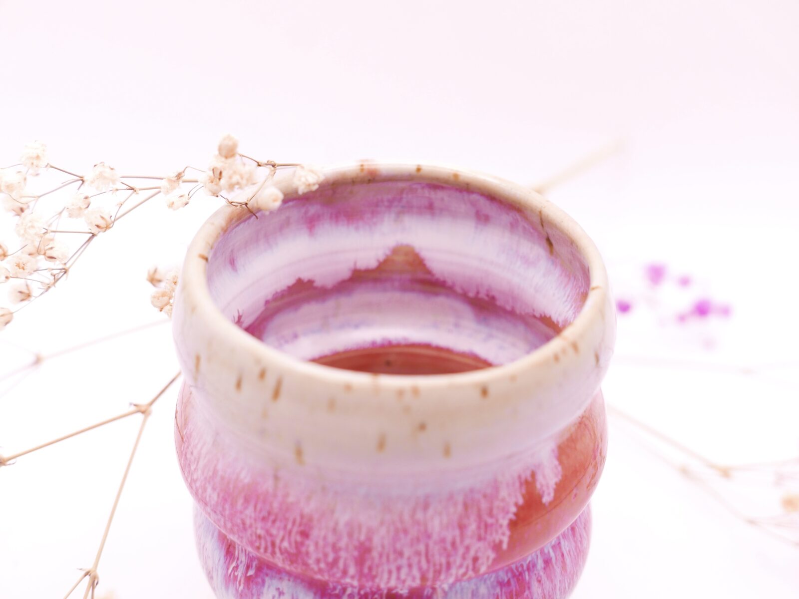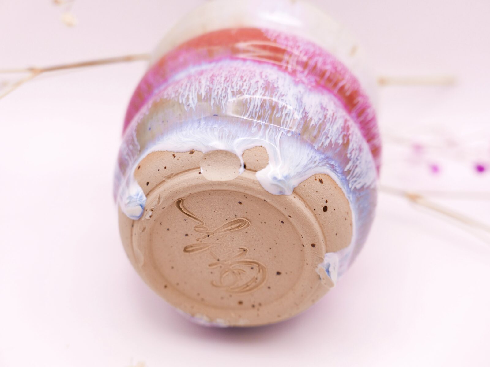 Wybrzuszona czarka wytoczona na kole z użyciem unikalnej przepiórczej gliny. Posiada efekt ociekającego lukru w odcieniach błękitu, bieli i różu.🍬