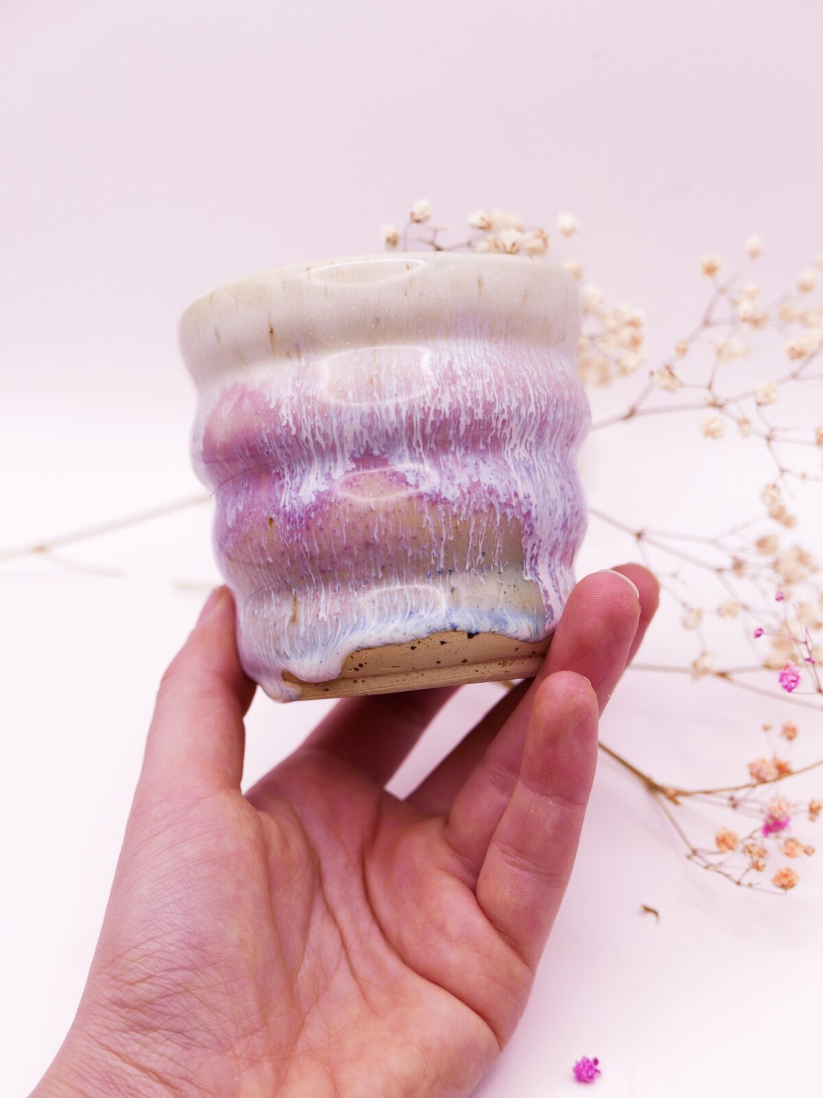 Wybrzuszona czarka wytoczona na kole z użyciem unikalnej przepiórczej gliny. Posiada efekt ociekającego lukru w delikatnych odcieniach fioletu, bieli i błękitu.🌊💜