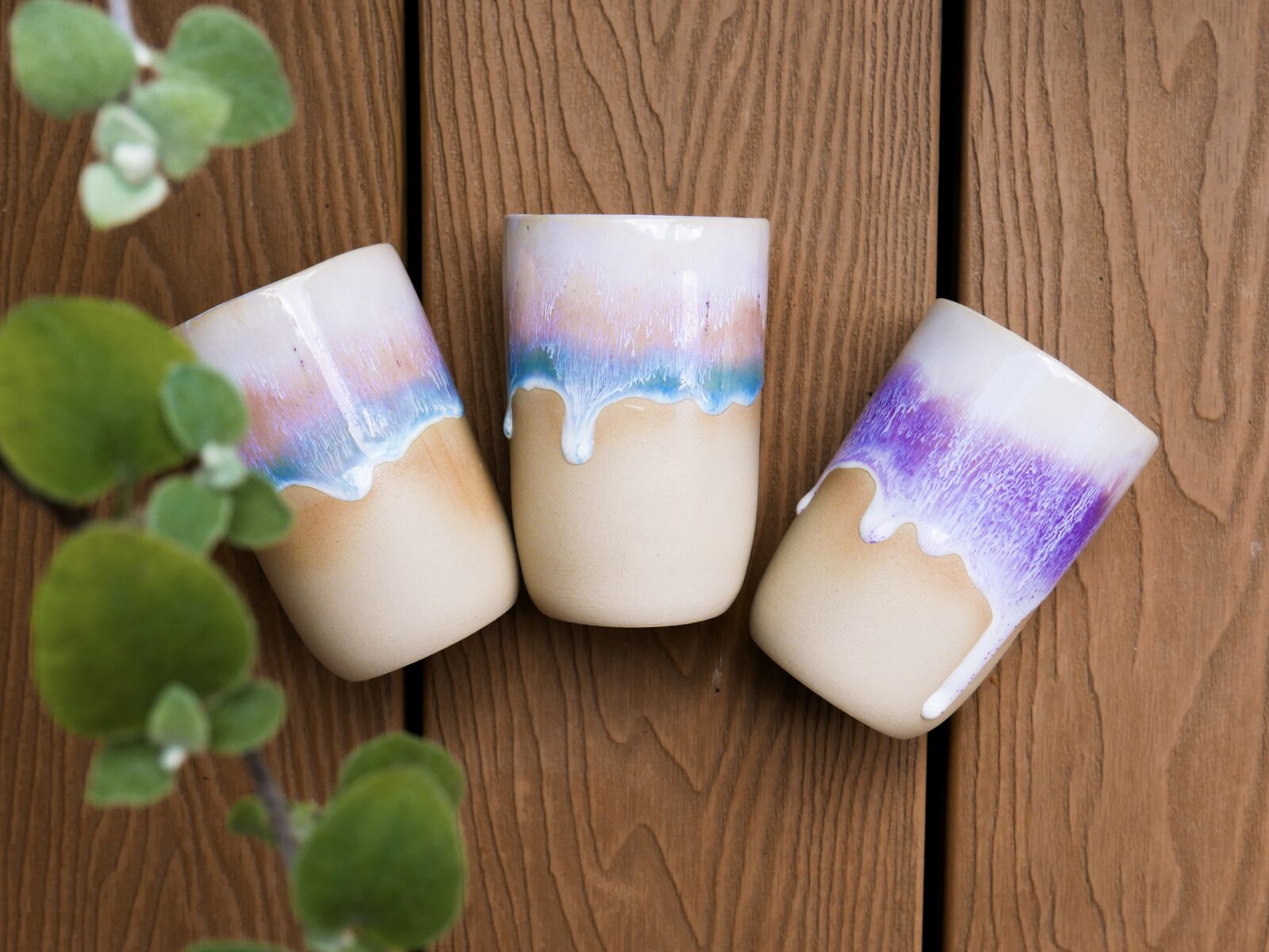 Wysoka czarka odlewana i malowana własnoręcznie z efektem ociekającego lukru w odcieniach błękitu, bieli i różu. Przypomina cukierek🍬