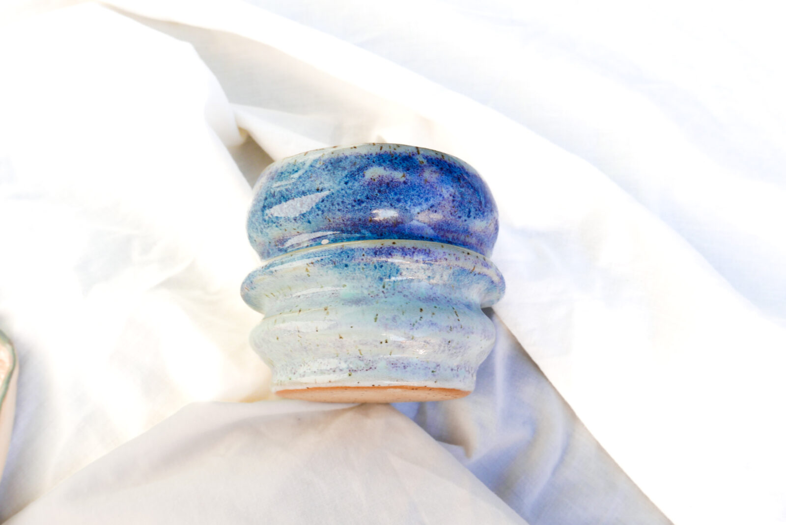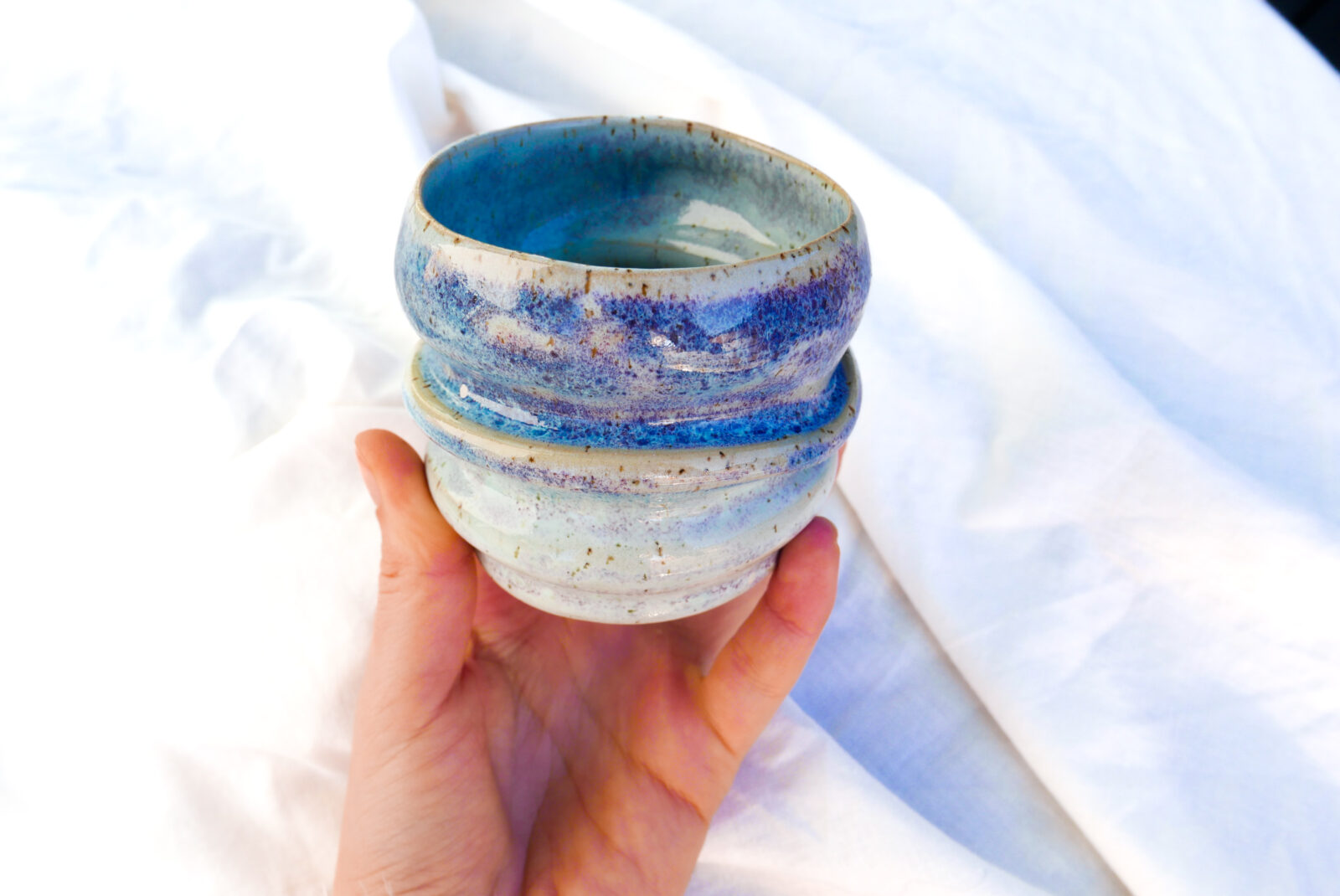 Unikalna czarka z krzywymi brzuszkami wytoczona na kole z użyciem przepiórczej gliny w ciapki. Poszkliwiona lazurowym, efektownym odcieniem.❄️
