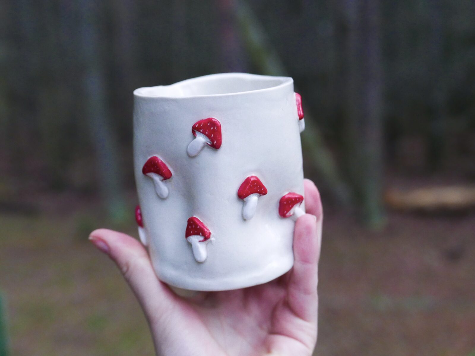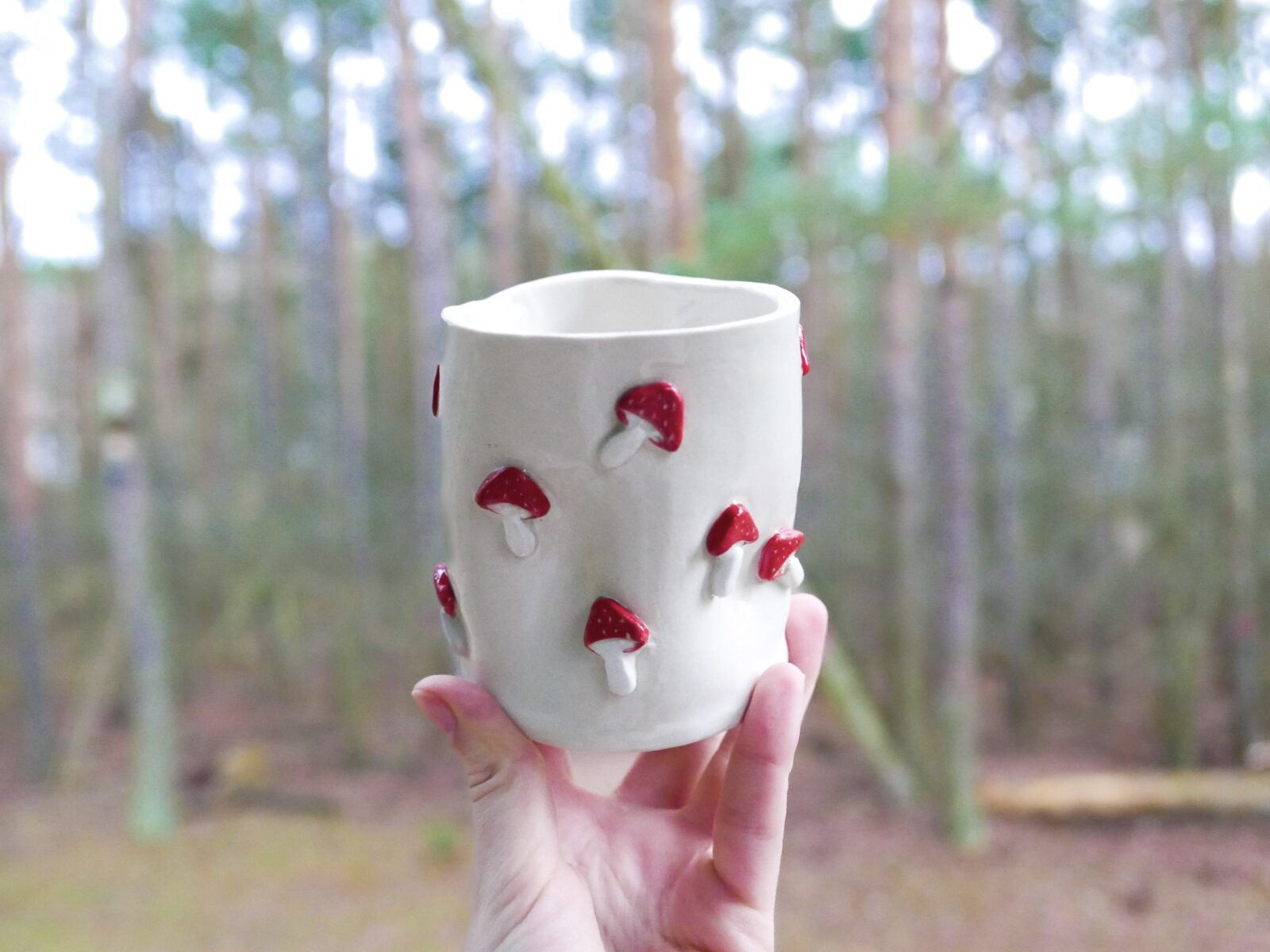 Czarka krzywulec dla jesieniarzy i grybiarzy, ulepiona z biało-porcelanowej gliny z namalowanymi czerwonymi muchomorkami 3D.