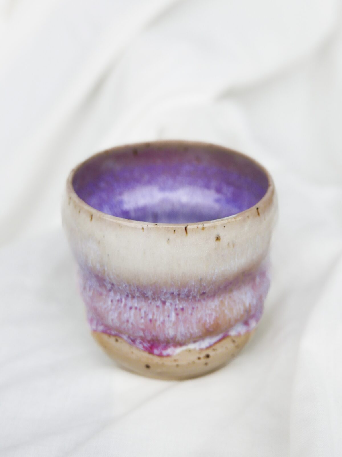 Czarka brzuszek wytoczona na kole z użyciem beżowej gliny w ciapki, poszkliwiona ociekającym lukrem o odcieniach bieli, fioletu i różu, przez które przenikają ciapki z gliny.