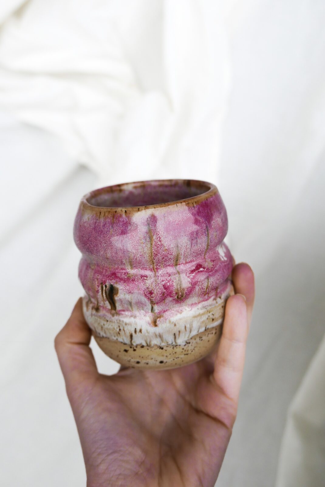 Czarka brzuszek wytoczona na kole z użyciem beżowej gliny w ciapki. Poszkliwiona odcieniami malinowego różu i beżu cappucino w spływające ciapki.☕️
