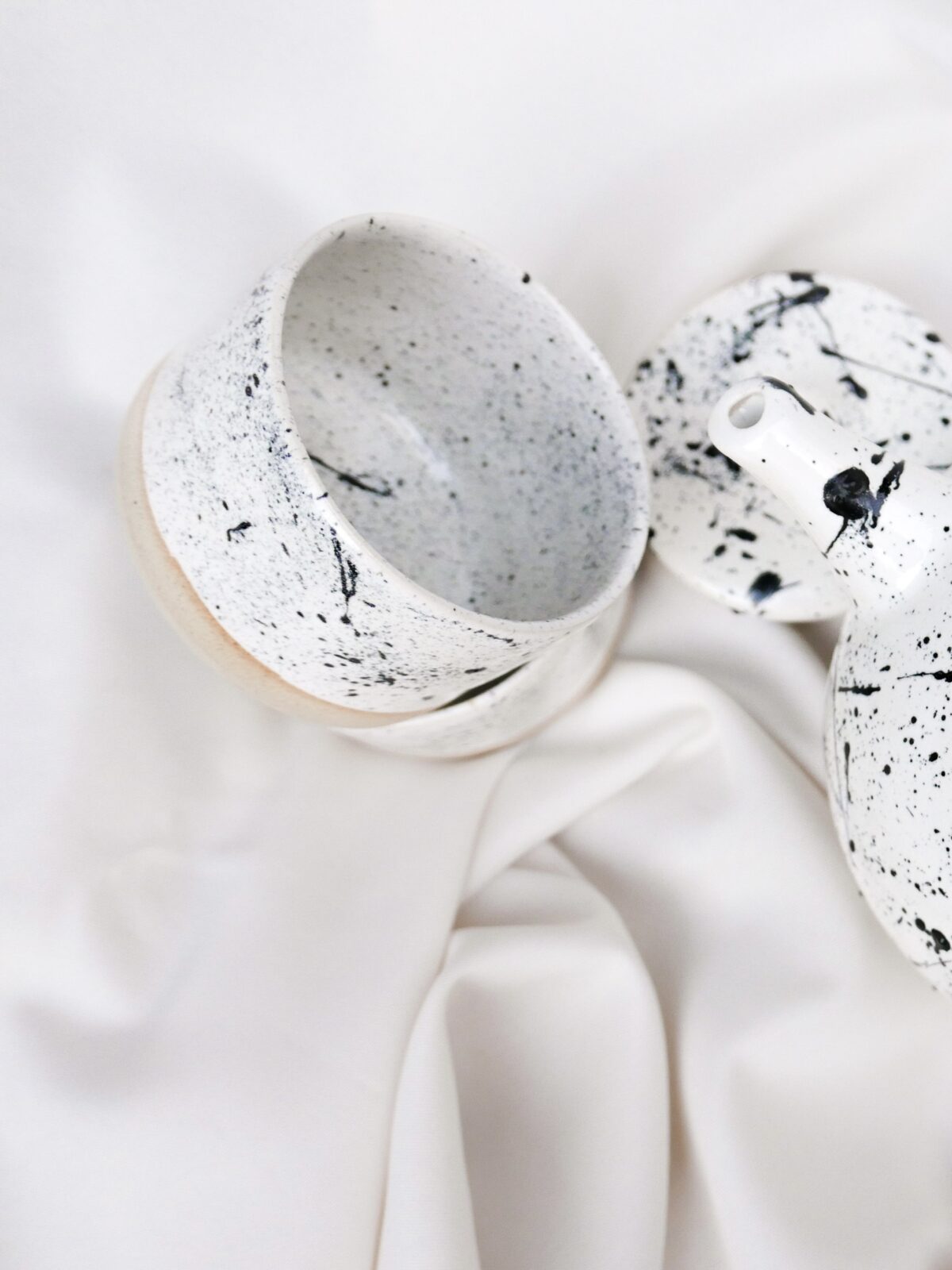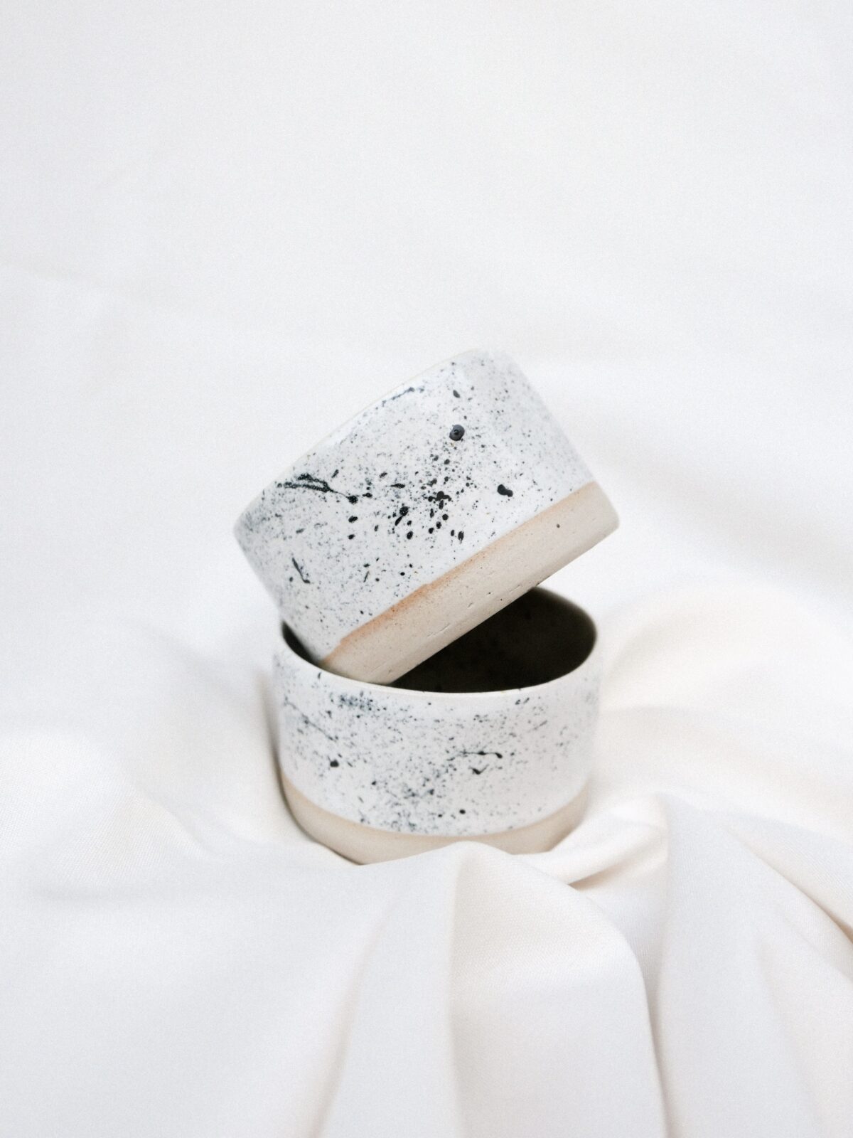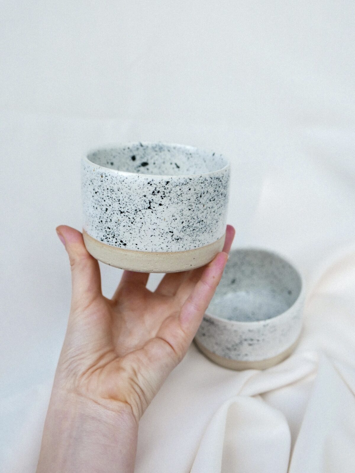 Duża czarka minimalistyczna, wytoczona na kole za pomocą kremowej gliny bez szamotu. Poszkliwiona białym odcieniem w czarne ciapki, dół czarki pozostawiony jest surowy.🤍🌱