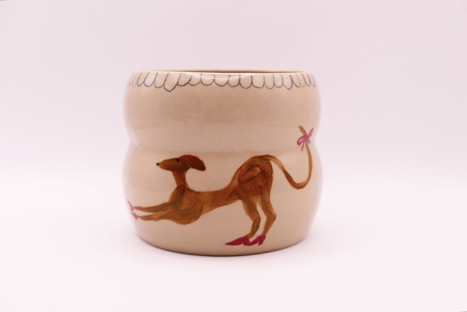Wybrzuszona odlewana czarka z własnoręcznie namalowanym brązowym charcikiem na obcasach.👠🐕