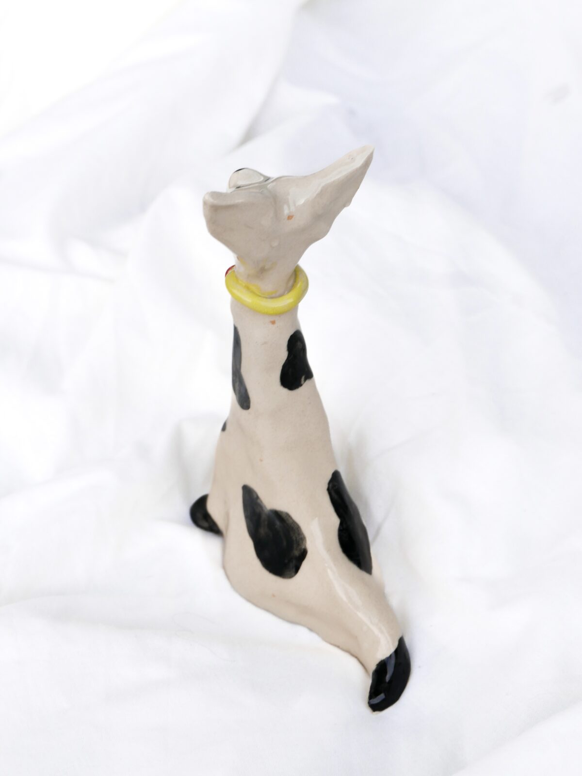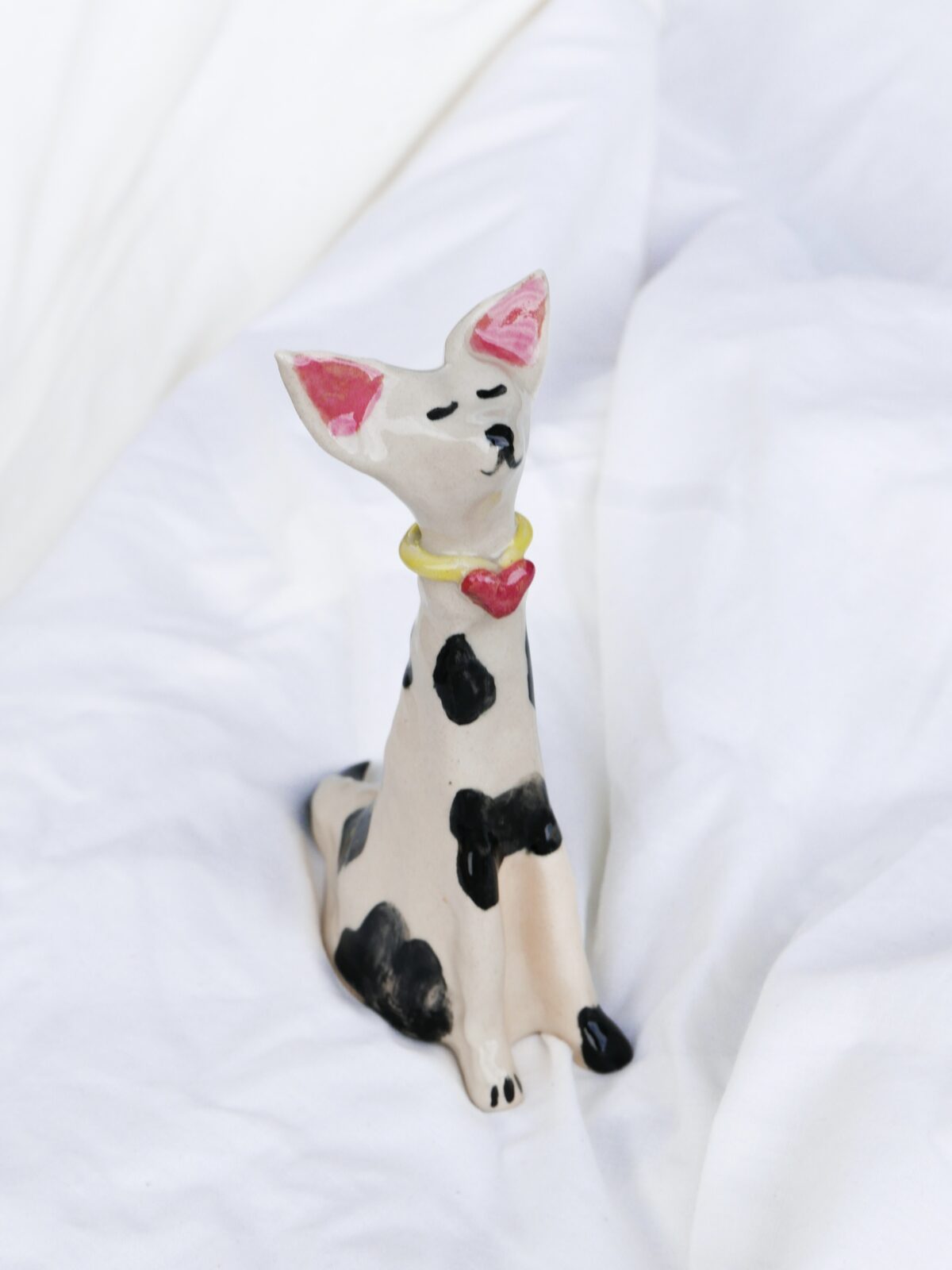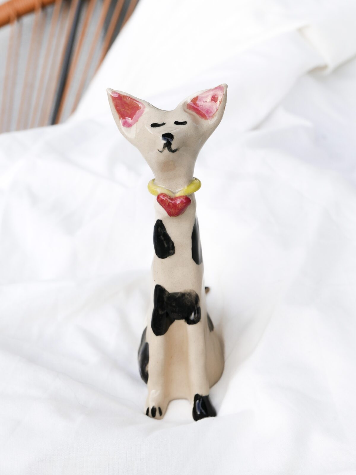 Figurka kocurka w ciapki ulepiona własnoręcznie za pomocą beżowej, gładkiej gliny.