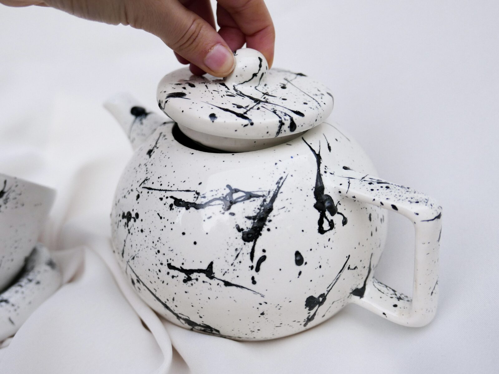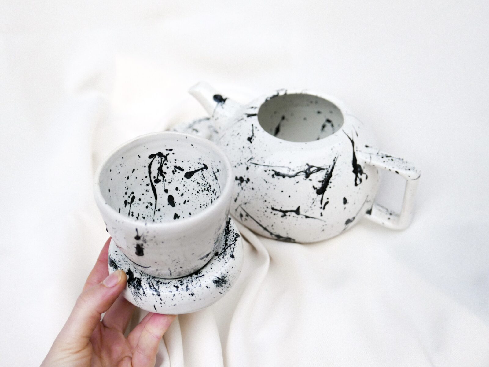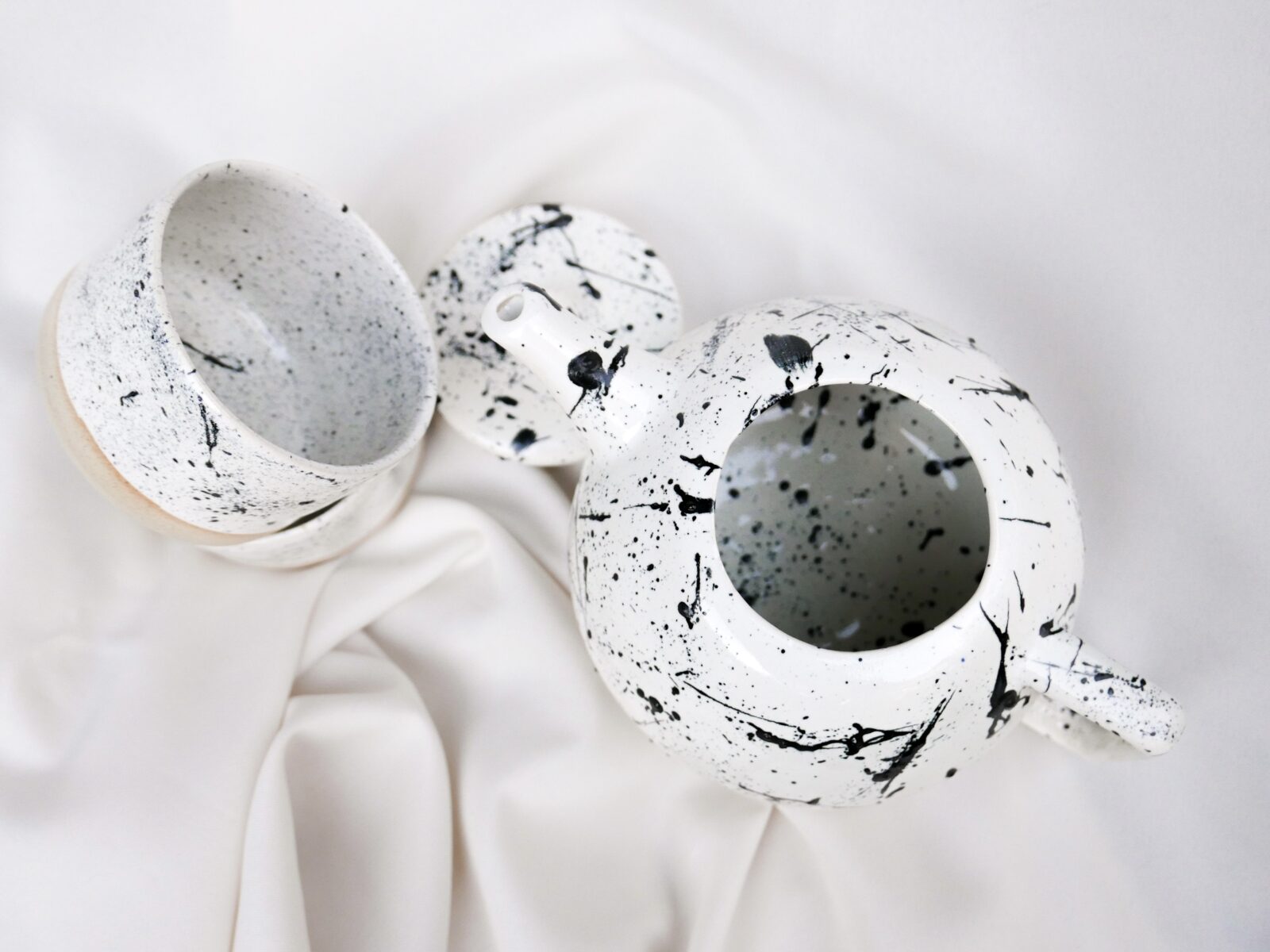 • Imbryk własnoręcznie odlewany z białej, porcelanowej gliny z czarnymi ciapkami o nieregularnych kształtach. Idealny na chłodny wieczór dla fanów straciatelli.