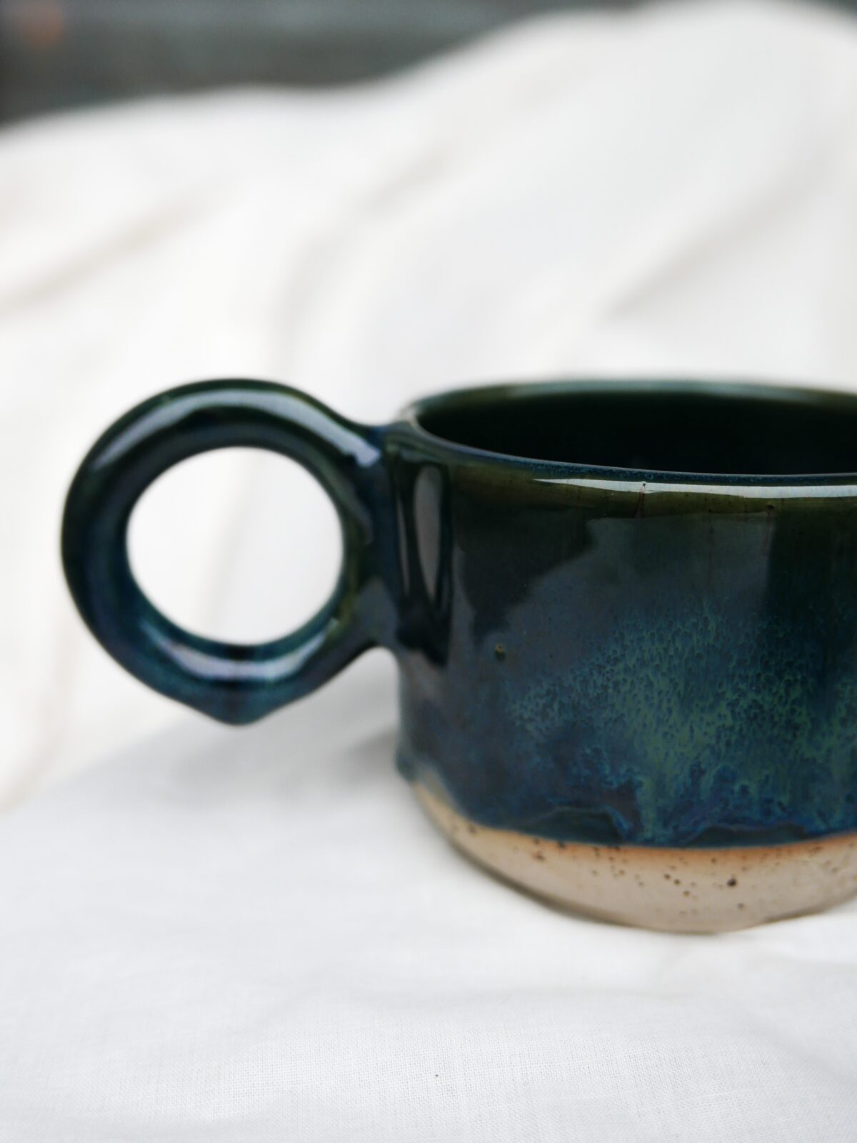 Duży kubek całkowicie wytoczony na kole z użyciem beżowej gliny w ciapki. Poszkliwony efektownymi, ciemnymi, granatowo – zielonymi odcieniami, których połączenie przypomina efekt delikatnej zorzy.🌌✨