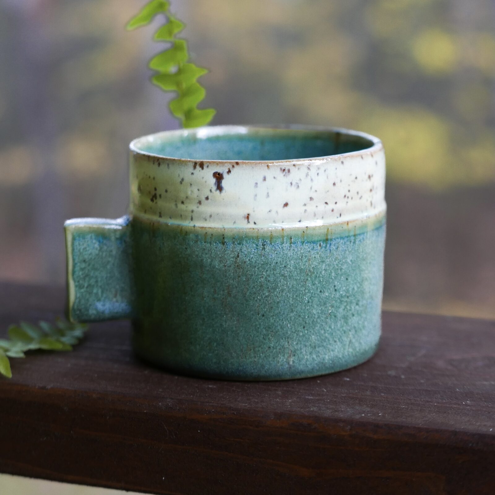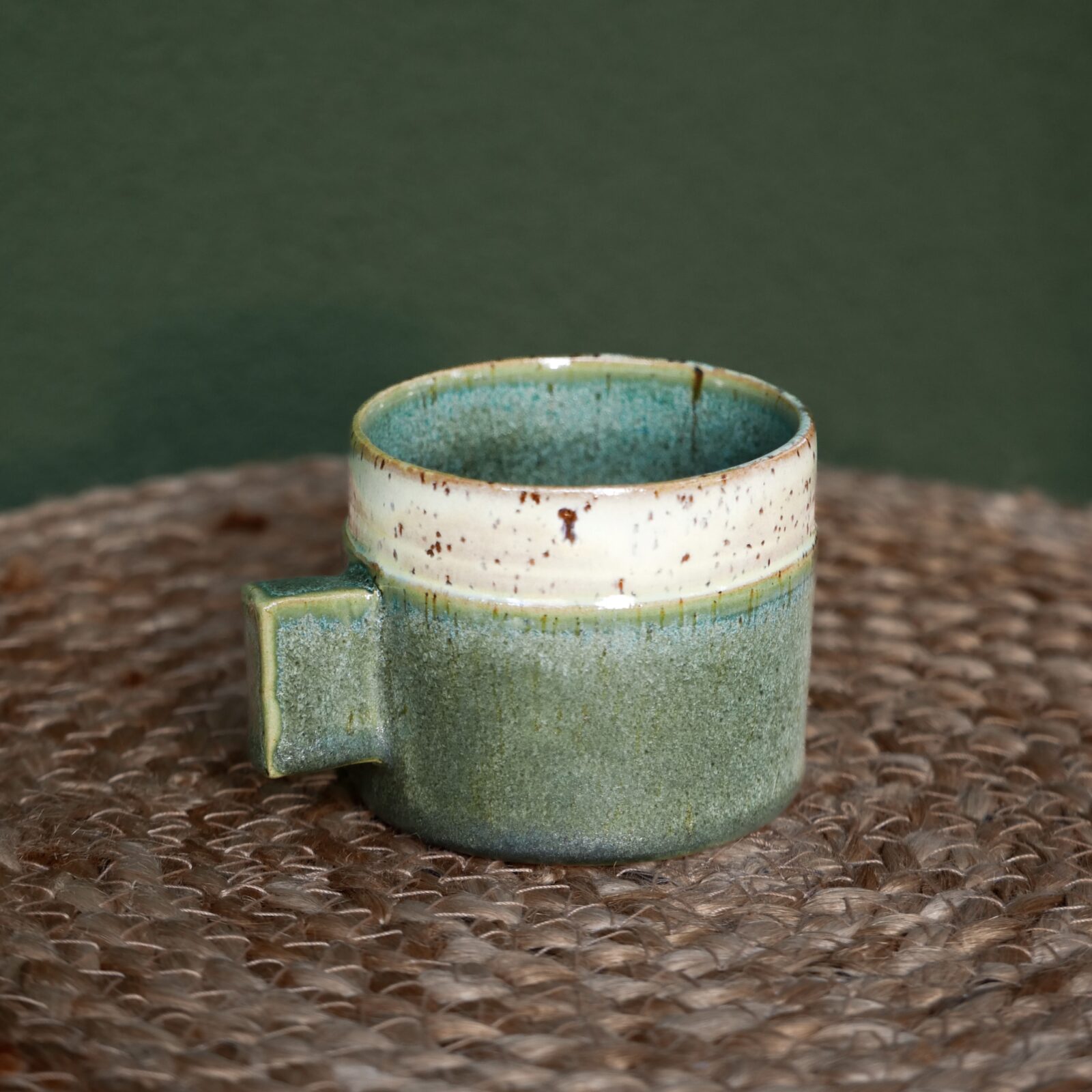 Kubek z prostokątnym uszkiem wytoczony na kole z użyciem beżowej gliny w ciapki. Poszkliwiony odcieniami satynowej zieleni i kremowej bieli🤍🌳