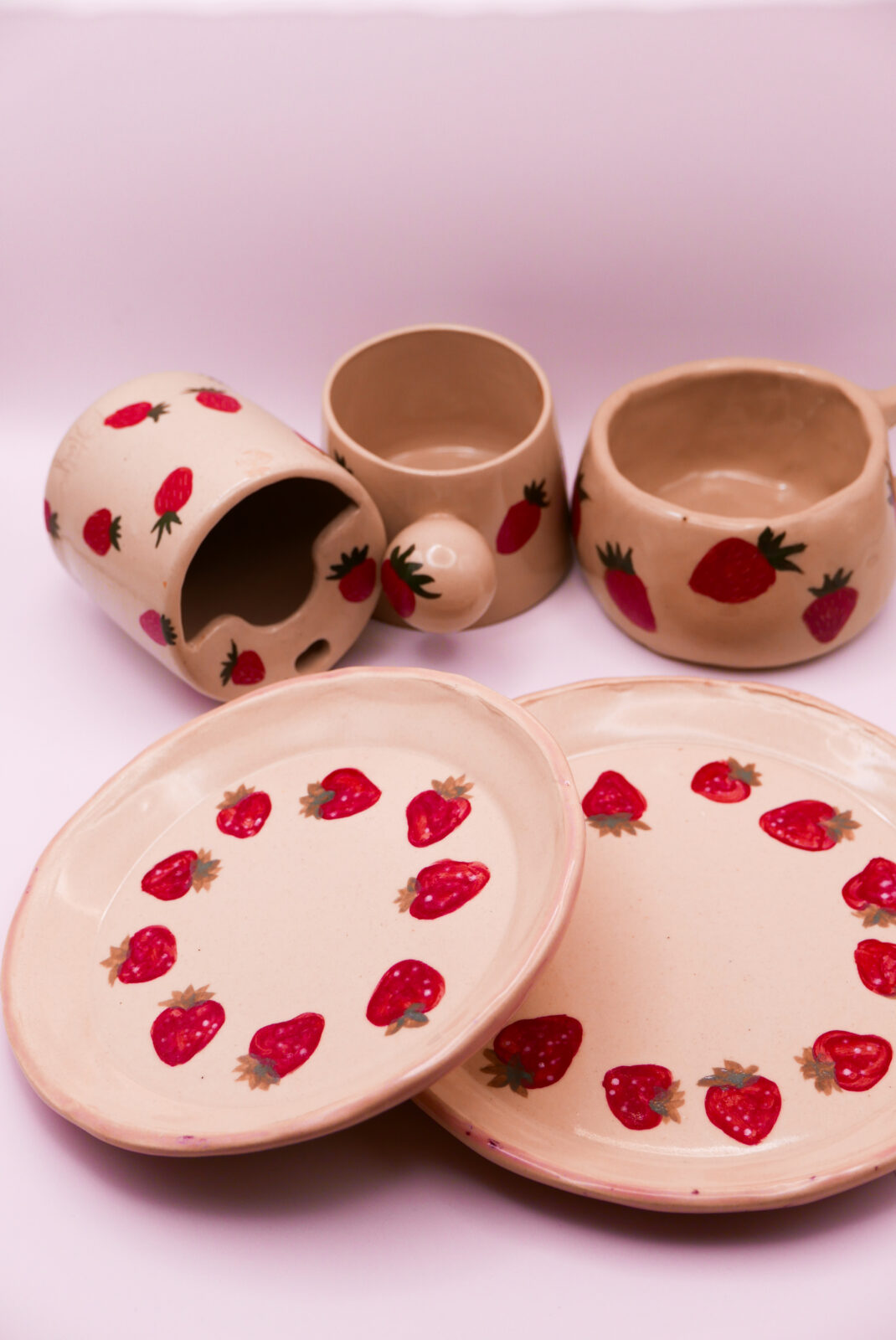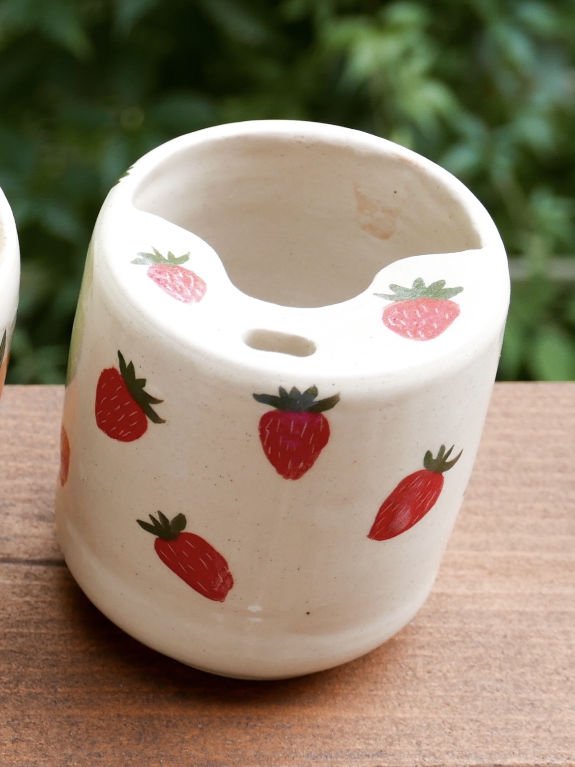 Kubek wytoczony na kole z użyciem kremowej gliny z namalowanymi ręcznie truskawkami.🍓