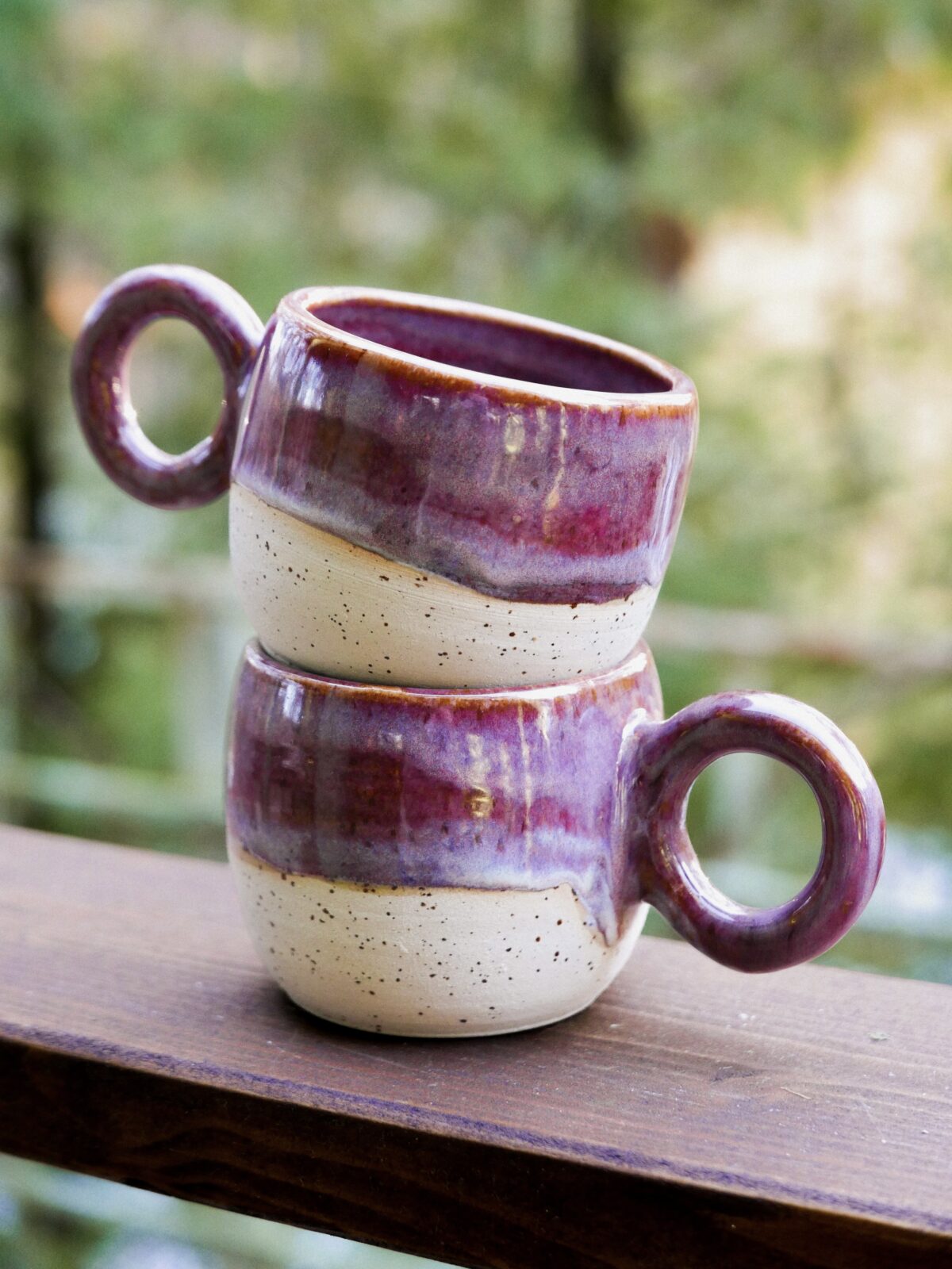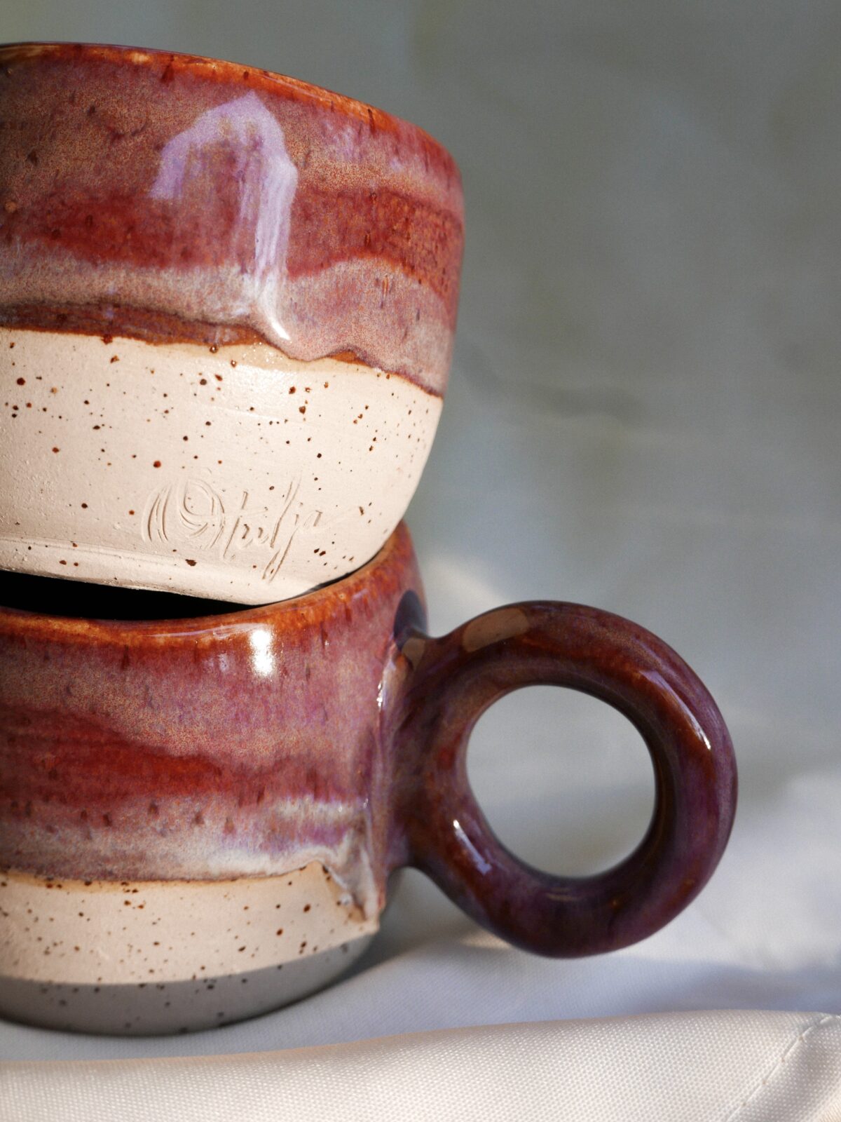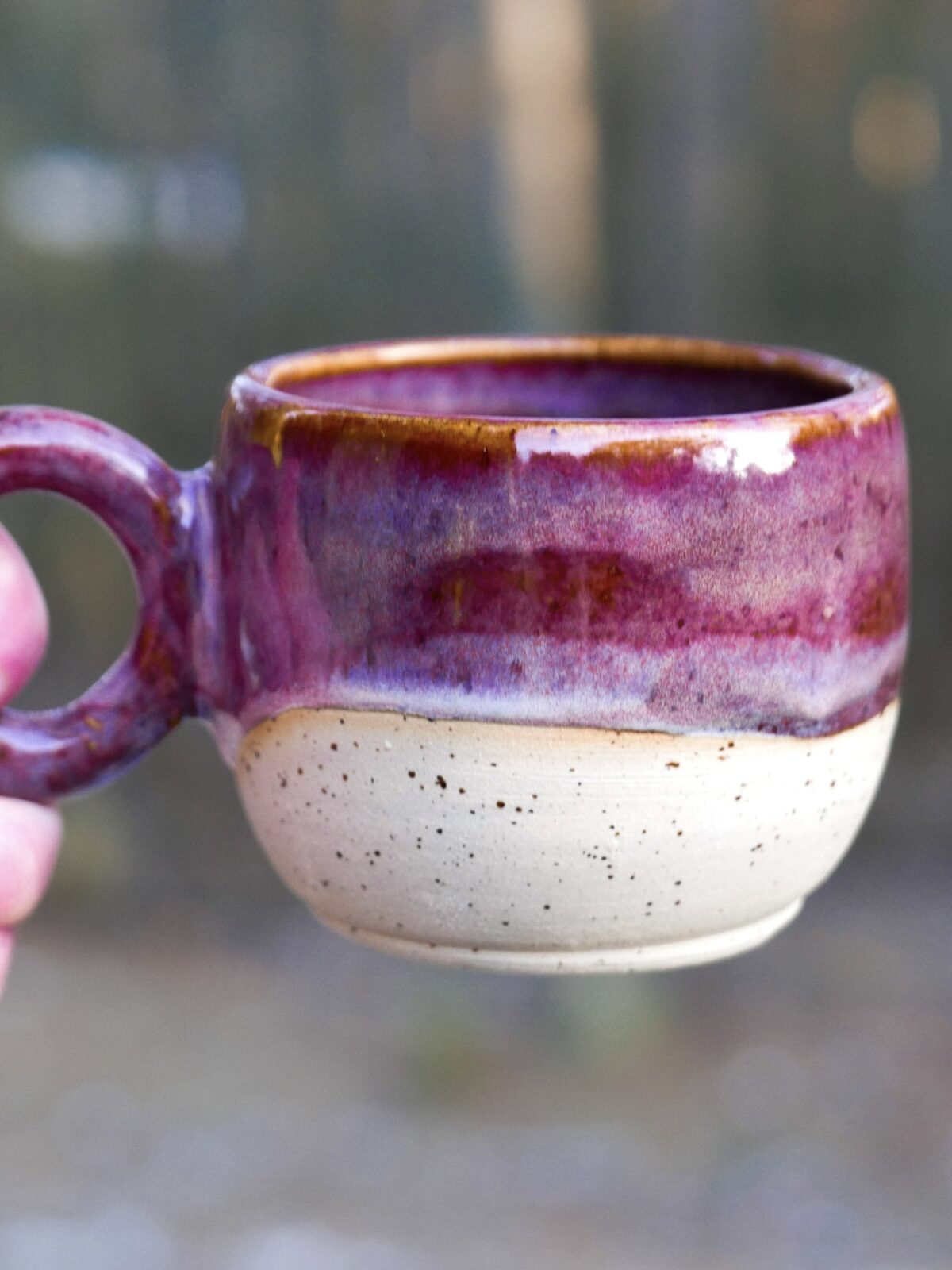 Kubek całkowicie wytoczony na kole z użyciem beżowej gliny w ciapki, poszkliwiony efektownymi odcieniami brudnego fioletu z przebłyskami jaśniejszych odcieni, przypominający efekt śliwkowej polewy.