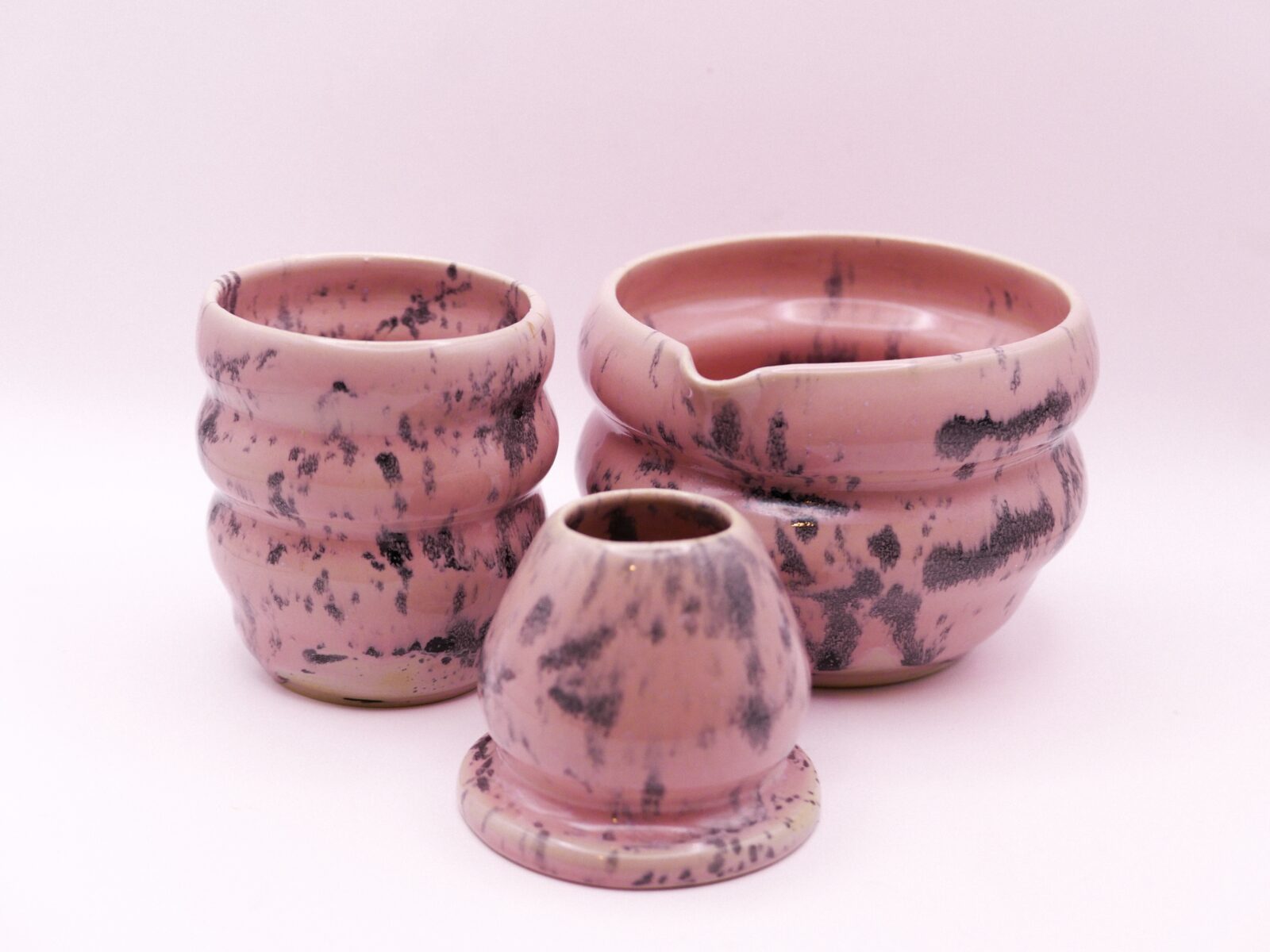 Zestaw serduszkowy składający się z czarki, miseczki do mieszania matchy i trzymadełka do miotełki, to mały rytuał zamknięty w pudrowo-różowych barwach z czarnymi ciapkami, niczym różowy tygrysek.🐅🩷