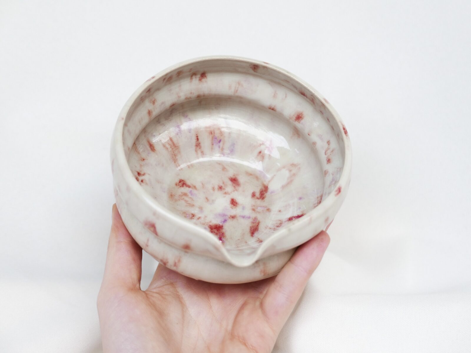 Miseczka do przygotowywania matchy brzuszek wytoczona na kole z użyciem kremowej gliny. Poszkliwiona kremowym odcieniem z nieregularnymi ciapkami w odcieniach różu.🌸