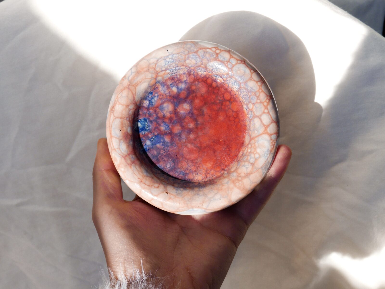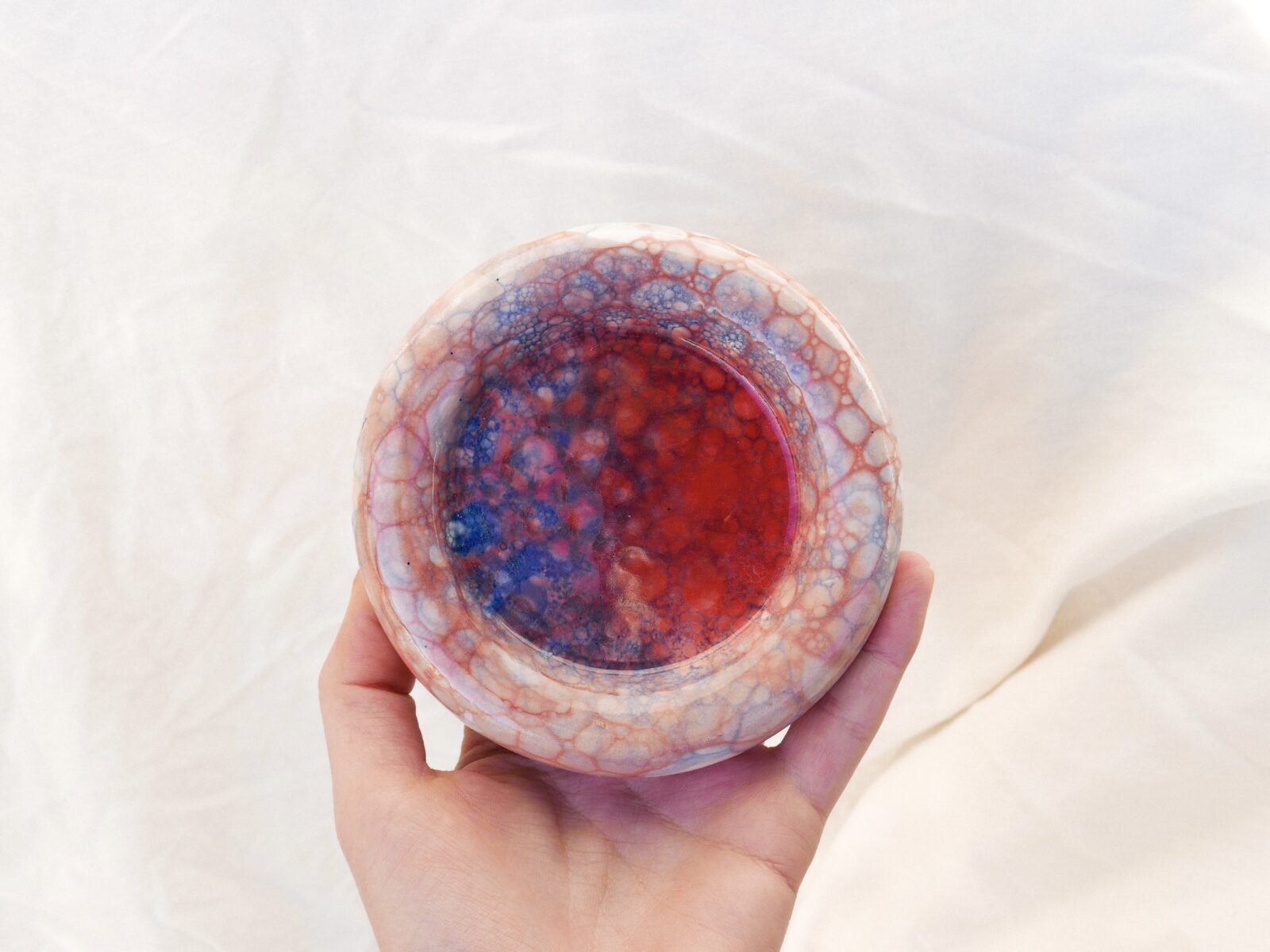 Talerzyk pączuś bubble odlewany własnoręcznie z białej gliny, poszkliwiony metodą bąbelkową w odcieniach granatu i czerwieni, wpadającej w koralowy odcień. Efekt jest hipnotyzujący.🫧