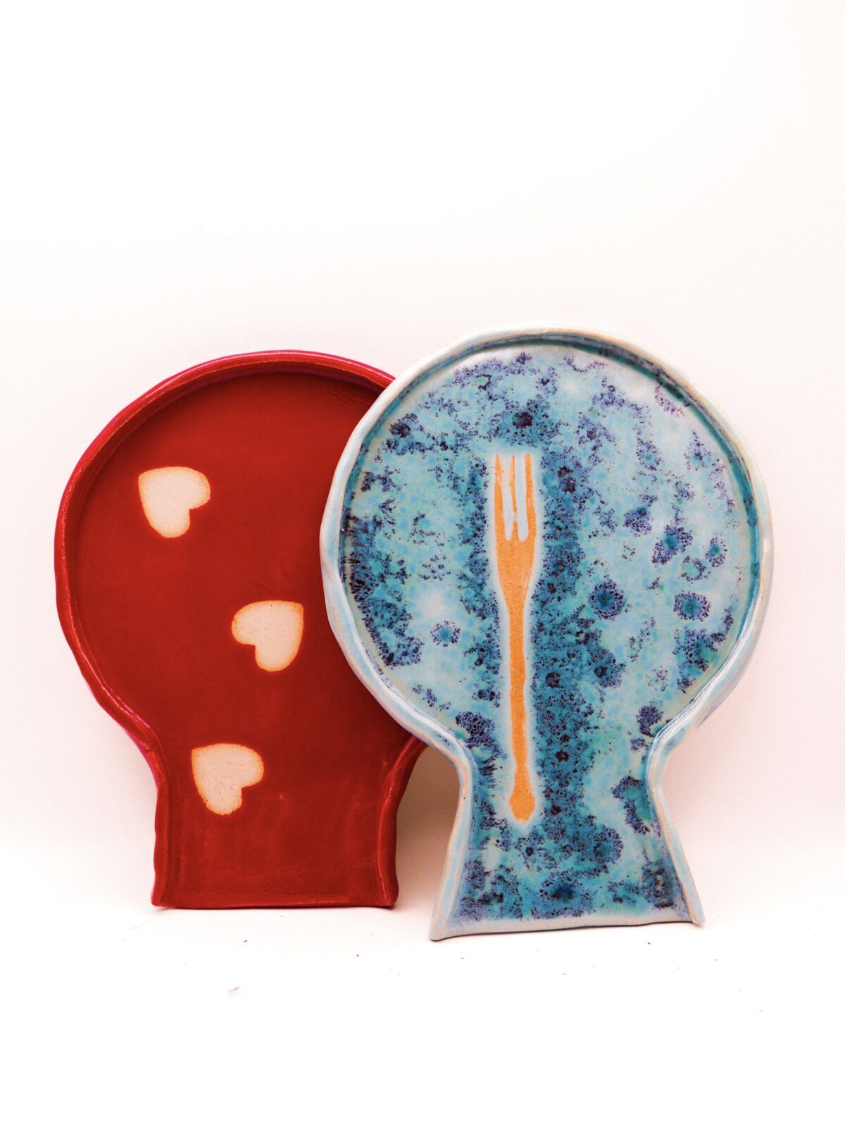 Trzymadełko do łyżek/szpatułek ulepione własnoręcznie z jasnej gliny, poszkliwione burgundową, intensywną czerwienią z kremowymi serduszkami.