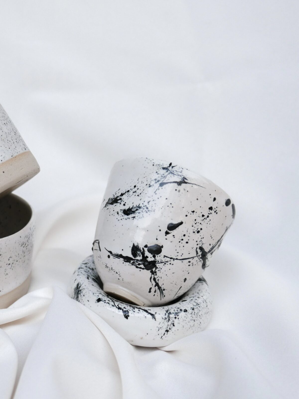 Zestaw czarka + talerzyk pączuś całkowicie wytoczony na kole i poszkliwiony ręcznie białym szkliwem z czarnymi ciapkami o nieregularnych kształtach, niczym straciatella.