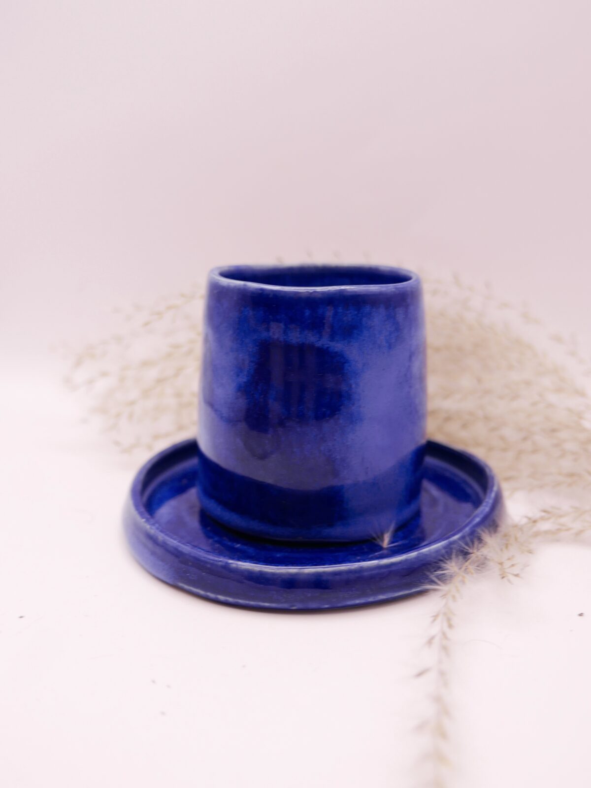 Zestaw kubeczek + talerzyk wytoczony na kole w odcieniu intensywnego granatu z przebłyskami jaśniejszych odcieni, co nadaje mu lśniący efekt jak pływająca meduza.🪼 🩵🌊